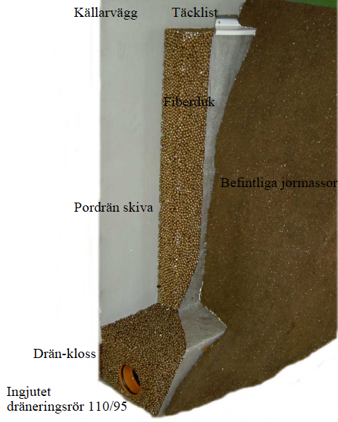 För att uppnå en högvärdig värmeisolerande dräneringskapacitet och för att säkerställa en torr källarvägg är det utomordentligt bra att använda sig av Drän-klossen. Som har en ingjuten dräneringsledning av plast 110/95. Ledningar med dagvatten eller stuprörsledningar får ej anslutas till dräneringsledning. Vid nyproduktion av källare skall dräneringsröret högsta punkt förläggas minst 100 mm under lägsta byggnadsdel och utföras med fall minst 1:200.